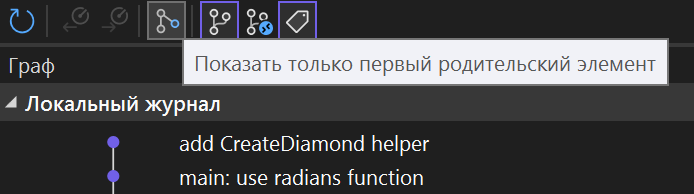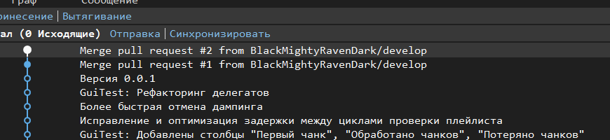 Но в visual studio в ветке master не видно коммитов, которые были сделаны перед pull requestами. Там отображается вот так:
